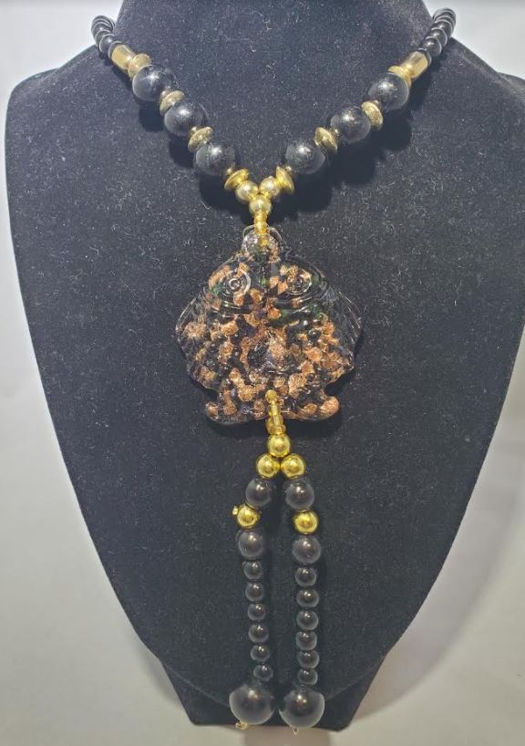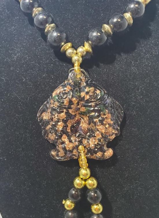 N2010 Black Bead Koi Fish Decorated Glass Long Necklace With Free Earrings