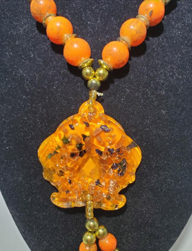 N2012 Black Bead Orange Koi Fish Decorated Glass Long Necklace With Free Earrings