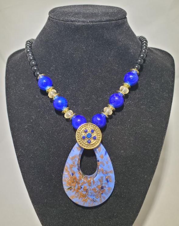 N303 Black Bead Royal Blue Decorated Teardrop Glass Long Necklace With Free Earrings