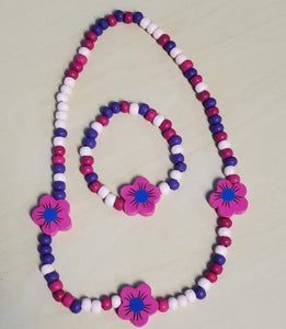 L450 Pink & Purple Flowers Wooden Necklace & Bracelet Set